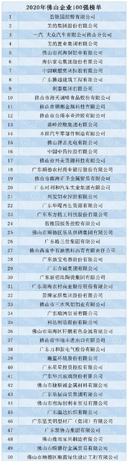 2020年佛山企業(yè)100強完整榜單如下: