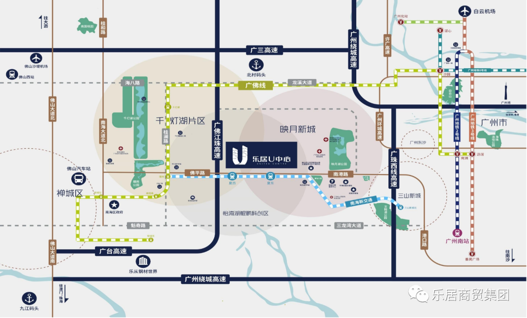 樂居U中心地處佛山一環創新圈核心位置,坐落廣佛江珠高速與佛平三路交界,位于佛山一環創新帶正中心,距離三龍灣片區僅10分鐘車程。并處在南海有軌電車1號線上,同時享夏西、夏東兩站出口的便利。